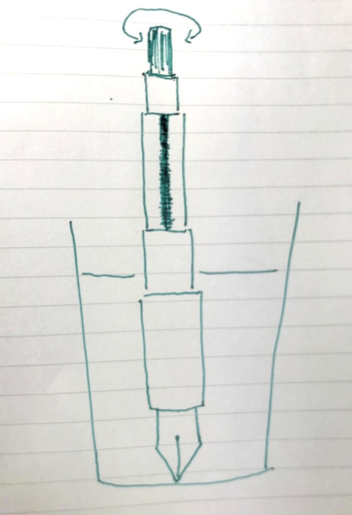 ただ、カートリッジを使っている場合は上記の方法で済みますが、コンバーターと吸引式は、インクタンク(インクをためているところ)を洗浄する必要があります。これがやや面倒な側面があります。インクタンクを洗浄する具体的な方法は、水をためた容器から水を吸い上げて排出するの繰り返しです。
